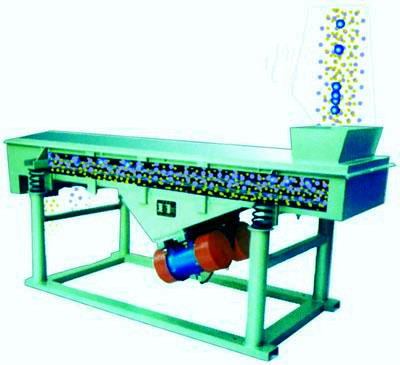 該機(jī)利用振動電機(jī)激振作為振動源,使物料在篩網(wǎng)上被拋起,同時向前作直線運(yùn)動,物料從給料機(jī)均勻地進(jìn)入篩分機(jī)的進(jìn)料口,通過多層篩網(wǎng)產(chǎn)生數(shù)種規(guī)格的篩上物、篩下物、分別從各自的出口排出。